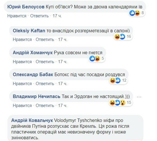 «Кутьи объелся? Может, за двумя календарями ел», «то вследствие разгерметизации в салоне», «рука совсем не гнется», «ботокс во время посадки раздулся», «мифы о двойниках Путина распускает сам Кремль. Эта рожа после пластических операций имеет неопределенную форму и может меняться», «Возили лицом по столу перед встречей - внушали постулаты», «Перегрелся в шерстяной кофте в церкви при свечах», – иронизируют пользователи в комментариях.