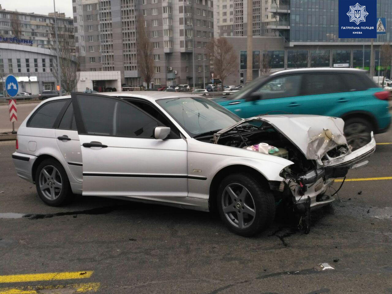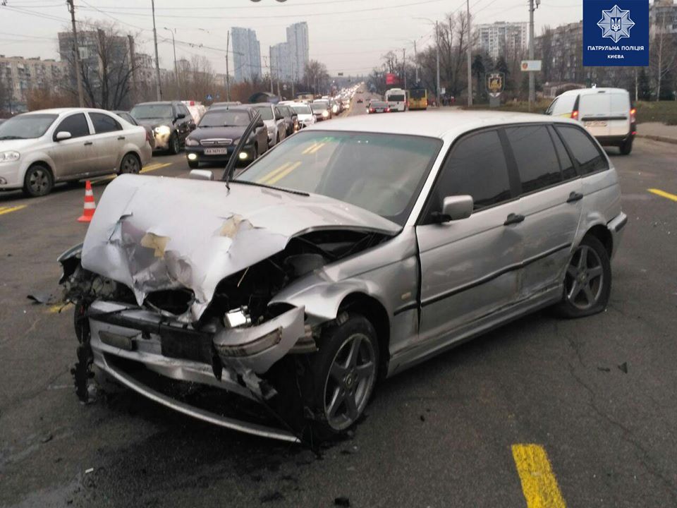 "По предварительной информации, водитель автомобиля Subaru, двигаясь по проспекту Соборности в сторону бульвара Дружбы Народов, не учел дорожной обстановки и выехал на полосу встречного движения, в результате чего допустил столкновение с автомобилем BMW, который двигался в попутном направлении", - сказано в сообщении патрульной полиции Киева.