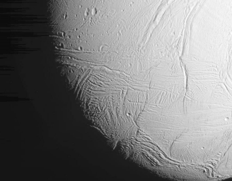 На снимке видно, что поверхность Энцелада покрыта ярко-белой коркой льда. Ученые отмечают, что спутник частично можно сравнить с Землей, правда его ширина всего 500 километров.