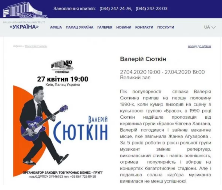 Согласно анонсу, в апреле в Украину с концертом приедет российский певец Валерий Сюткин, который в начале 90-х входил в состав рок-группы "Браво". Его выступление запланировано в одной из крупнейших концертных площадок – "Дворце Украина".
