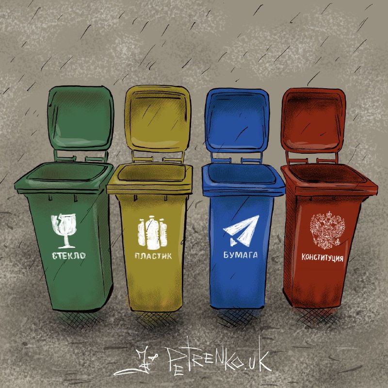 На изображении нарисованы мусорные баки с разным предназначением: для стекла пластика и бумаги. Однако на последнем контейнере написано слово "Конституция" и нарисован герб РФ.