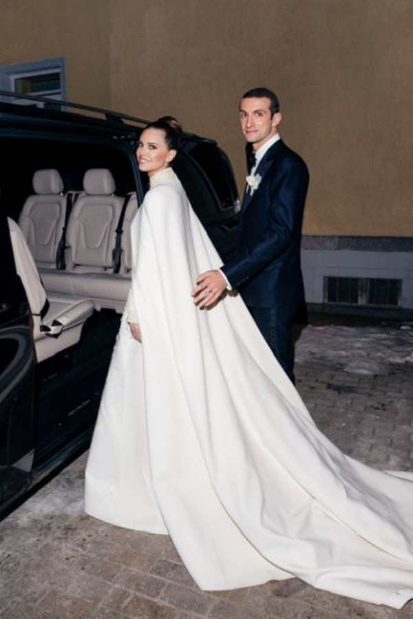 38-летняя невеста (бизнес-леди, дизайнер и коллекционер произведений искусства), была в роскошном белом зимнем платье с накидкой-шлейфом. 34-летний жених — в классическом смокинге.
