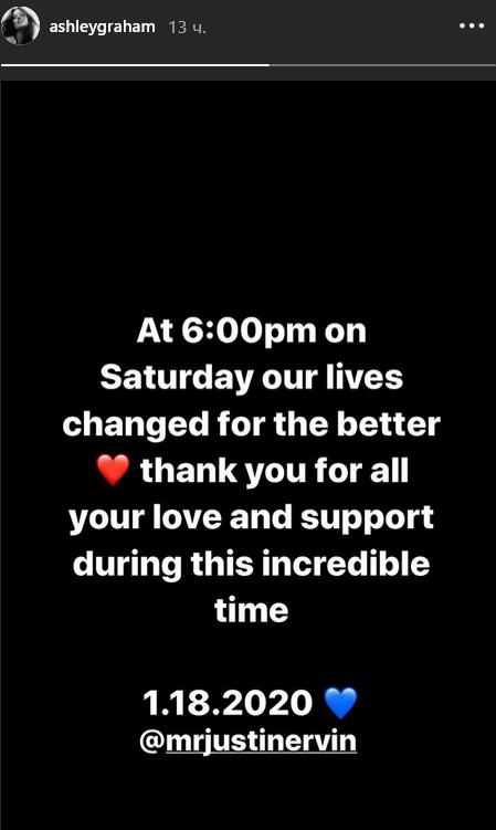 "В 6 часов вечера, в эту субботу наши жизни изменились в лучшую сторону. Спасибо вам за ваши любовь и поддержку в это невероятное время. 18.01.2020", - написала Эшли.