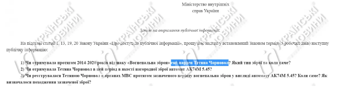 Кроме того, в ответе на редакционный запрос в Нацполиции отказались предоставлять ифнормацию о возможном правомерном владении Черновол боевым автоматическим оружием, сославшись на законодательные положения о защите персональных дачных физического лица.