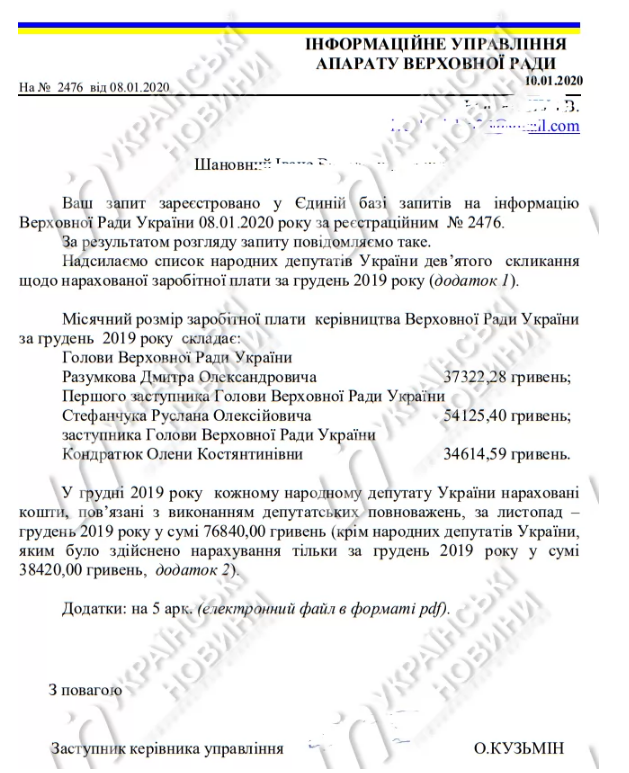 Кроме того, Разумкову, Стефанчуку и Кондратюк было начислено по 76 840 гривен на выполнение депутатских полномочий за декабрь и ноябрь.