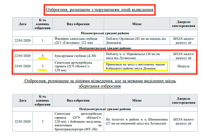 В документе сообщалось, что наблюдатели зафиксировали перемещения трех единиц самоходных артиллерийских орудий 2С9 "Нона-С", 120 мм, которые направлялись на запад в жилом массиве Киевского района города Донецка.