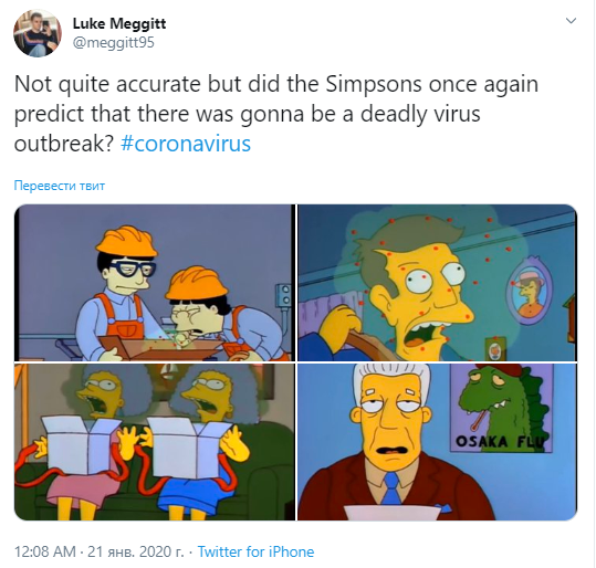 «Симпсоны, что, снова предсказали вспышку смертельного вируса?», — такое сообщение в соцсети оставил юзер @meggitt95.