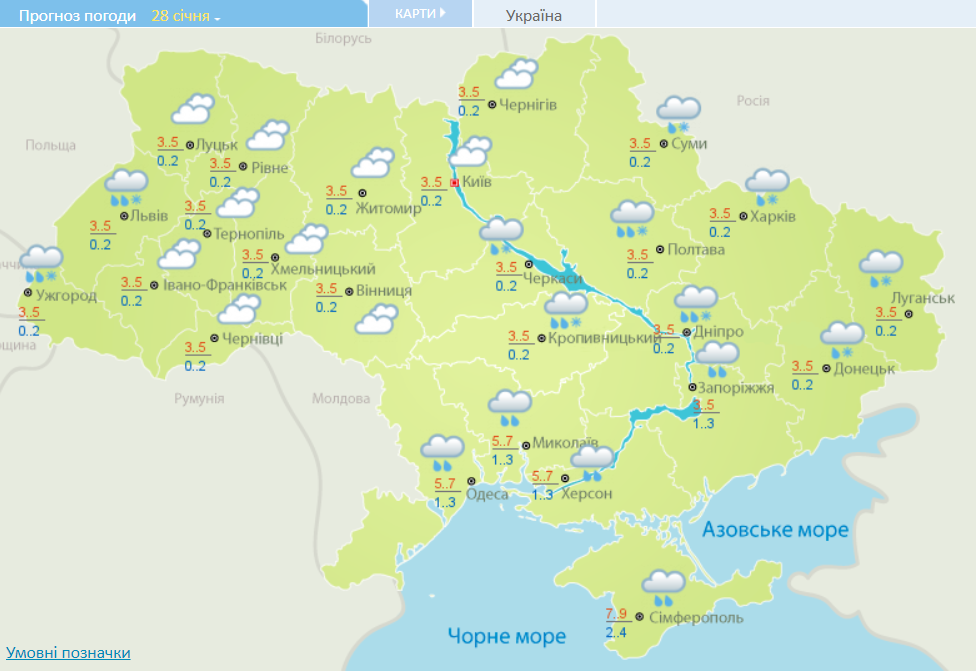 Во вторник, 28 января, в южных, большинстве центральных, днем также в восточных областях и на Закарпатье дождь и мокрый снег. Ветер южный, 7-12 м/с.