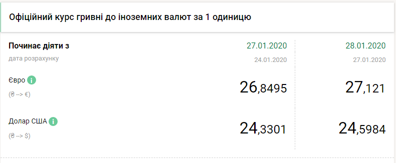 Национальный банк Украины на вторник, 27 января, понизил курс гривны на 26 копеек по отношению к доллару и на 28 по отношению к евро, передает FaceNews.ua. Об этом свидетельствуют данные на сайте регулятора в понедельник, 27 января.