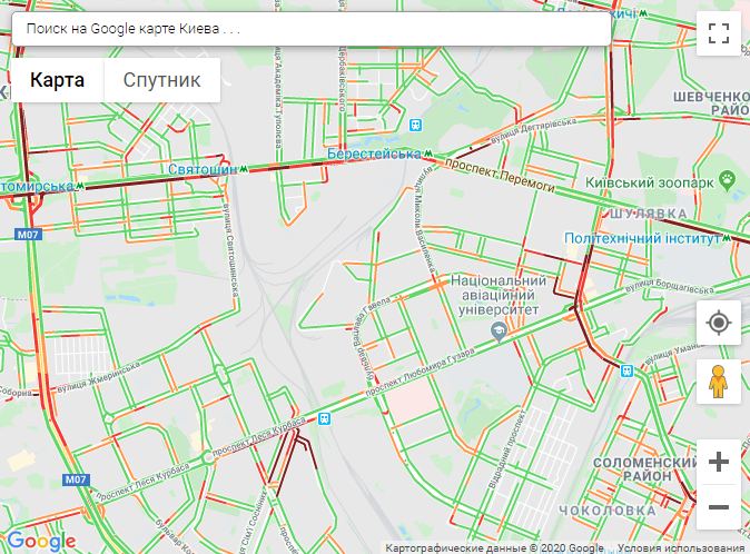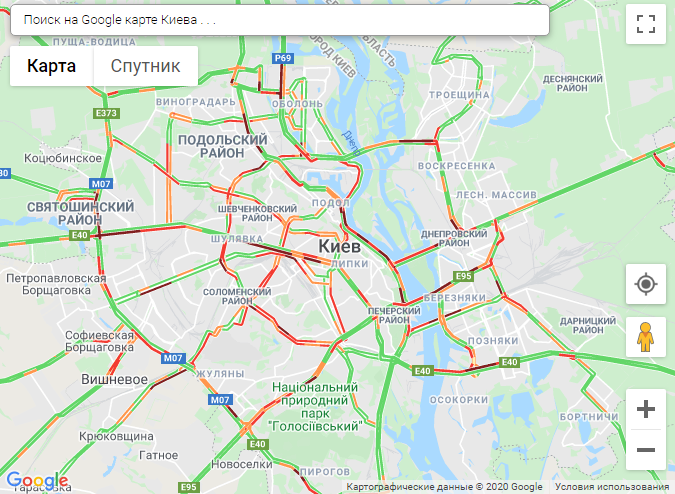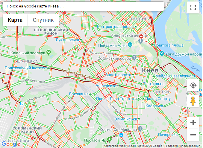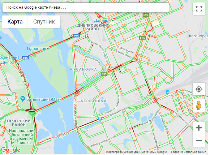 По данным онлайн-сервиса Google Maps, на правом берегу столицы движение транспорта затруднено на проспекте Победы, проспекте Курбаса, Голосеевском проспекте, проспекте Лобановского, ул. Богатырской, ул. Вадима Гетьмана, бульваре Тараса Шевченко, бульваре Леси Украинки, ул. Бульварно-Кудрявская, ул. Жилянская, ул. Автозаводская, ул. ул Набережно-Рыбальская, Набережно-Крещатицкая, ул. Елены Телиги, проспекте Героев Сталинграда, на Набережном шоссе,