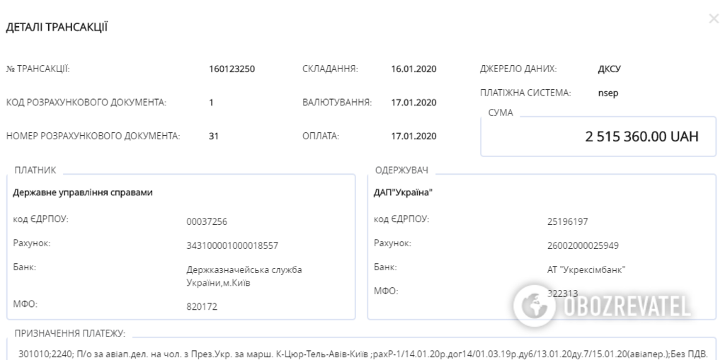 Соответствующие средства Государственное управление делами президента перечислило госавиапредприятию "Украина". Об этом свидетельствуют данные, которые появились в распоряжении OBOZREVATEL.