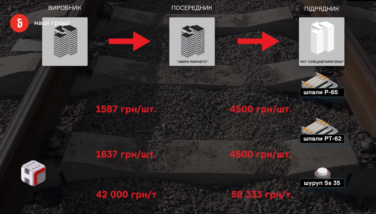 Журналисты установили, что компания покупала трамвайные рельсы, шпалы и комплекты скреплений не напрямую у производителя, а через фирму-посредника "Авира Маркетс". Этот процесс существенно повлиял на стоимость. Например, шпалы с комплектом скреплений к рельсам Р-65 посредник покупали у производителя по 1587 грн. за штуку, а продавали "Спецавтоматици" за 4500 грн за штуку - почти в три раза дороже.