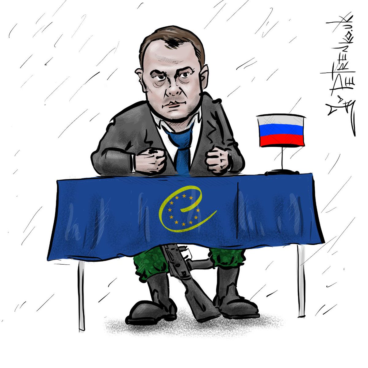 Российский политик изображен сидящим за столом, накрытым флагом Евросоюза, из под которого видны ноги Петра Толстого в армейских сапогах, а возле них - автомат Калашникова.