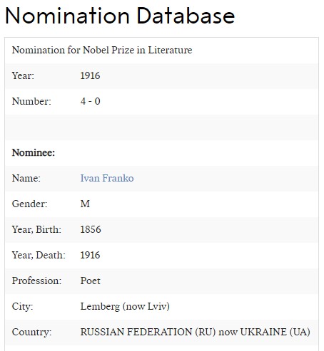 Выдающаяся личность для Украины и украинской литературы на сайте Нобелевского комитета был указан как представитель Российской Федерации. Данный факт отметил на своей странице в Facebook директор музея Франко во Львове Богдан Тихолоз.