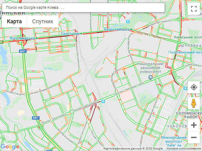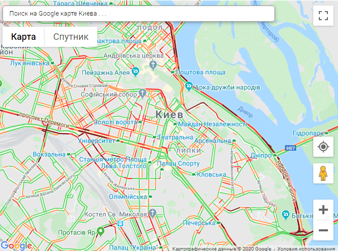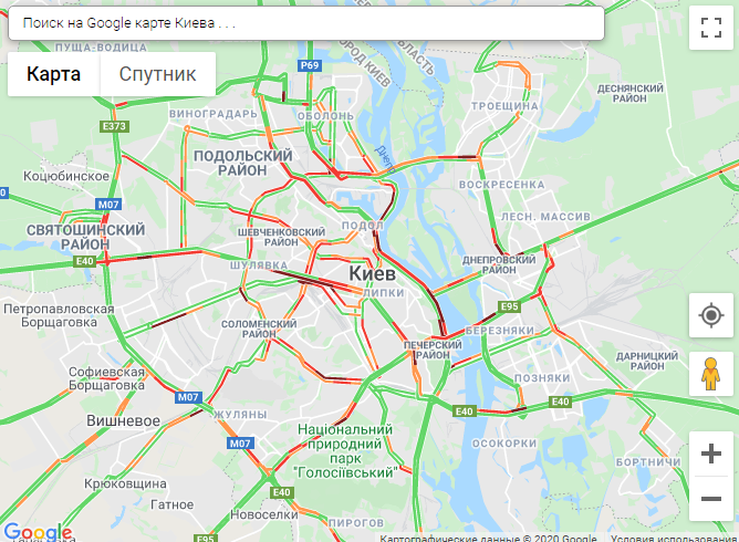 По данным онлайн-сервиса Google Maps, пробки образовались на проспекте Победы, проспекте Курбаса, бульваре Леси Украинки, бульваре Шевченко, ул. Большой Васильковской, ул. Бойчука, ул. Грушевского, на Набережном шоссе, Владимирском спуске.