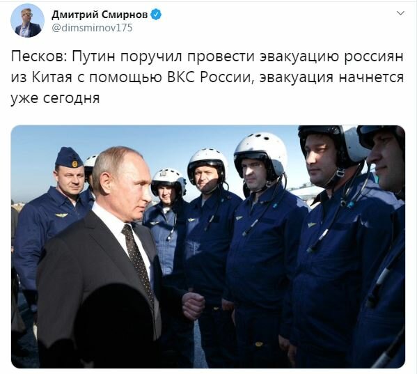 "Путин поручил провести эвакуацию россиян из Китая с помощью ВКС России, эвакуация начнется уже сегодня", - говорится в подписи к опубликованному снимку, на котором низкорослый Владимир Путин стоит в окружении летчиков.