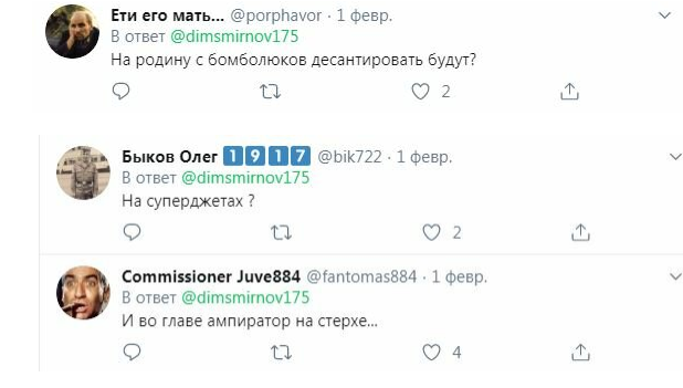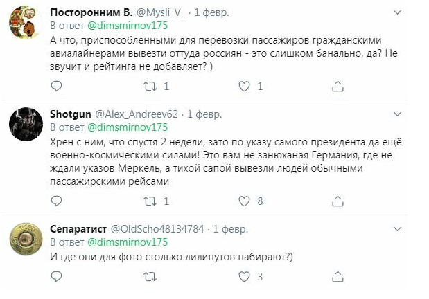 "А что, приспособленными для перевозки пассажиров гражданскими авиалайнерами вывезти оттуда россиян - это слишком банально, да? Не звучит и рейтинга не добавляет?", "И где они для фото столько лилипутов набирают?)", "Кто ж там такой важный в Китае остался? Наверное держатели ключей от денег общака в китайских банках?", "А если россияне не захотят эвакуироваться?", "Оперативненько...", "И во главе импиратор на стерхе...", - возмущаются комментаторы под публикацией Смирнова.