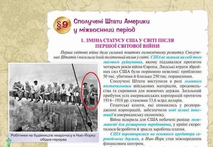 Вместо исторического снимка «Обед на небоскрёбе» 1932 года на 58-й странице украинского учебника по всемирной истории для 10 класса можно увидеть фотожабу, где рядом с рабочими сидит голливудский актёр Киану Ривз, передает FaceNews.ua.