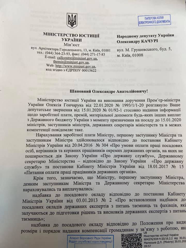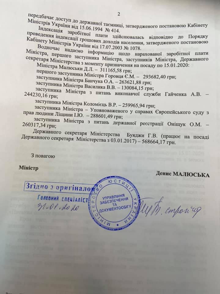 "Зарплата госсекретаря Минюста Буяджы Г.В с момента назначения составила - 568664,17 грн. Министра Малюськи Д.Л. - 311165,58 грн. Первого заместителя Горовца Е.М. - 293682,40 грн.", - добавил Качура.