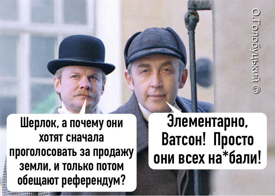 Для одной из картинок политолог и блогер Алексей Голубицкий использовал кадр из культового советского фильма "Приключения Шерлока Холмса". На рисунке напарник сыщика доктор Ватсон интересуется, почему депутатам сначала предлагают проголосовать за продажу земли, а только потом - за референдум по этому поводу. На это Холмс отвечает своей знаменитой фразой: "Это элементарно Вастон! Просто они всех на*бали".