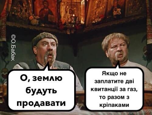 На второй картинке изображены персонажи фильма-сказки "Вечера на хуторе близ Диканьки”, обсуждающие продажу земли. При этом, один из них заметил, что, если не проплатить две платежки за газ, то землю продавать будут вместе с крепостными.
