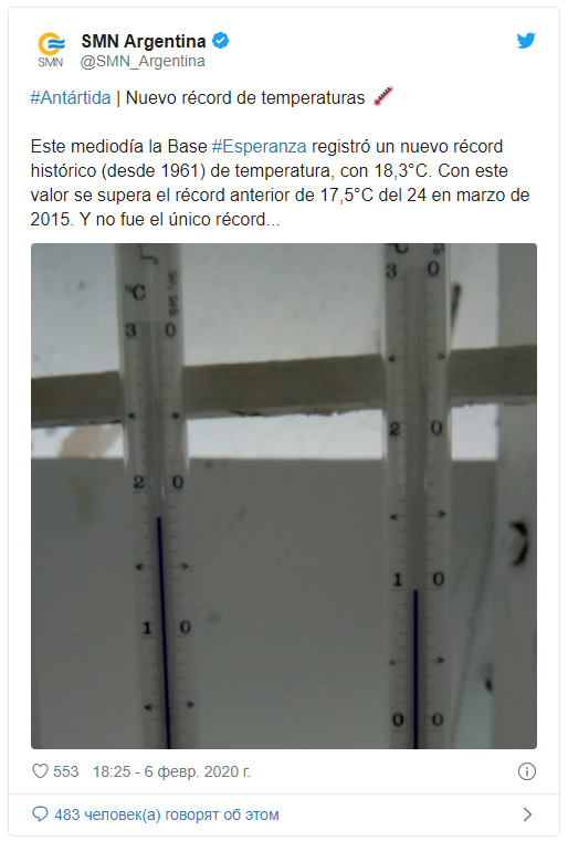 Плюс 18,3°C было вчера, 6 февраля, на территории аргентинской научно-исследовательской станции Esperanza на самом северной краю Антарктического полуострова.