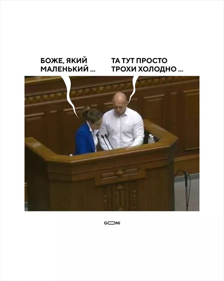 На фотожабе политики стоят возле трибуны, их взгляд направлен вниз. В диалоге речь идет о довольно пикантном вопросе.