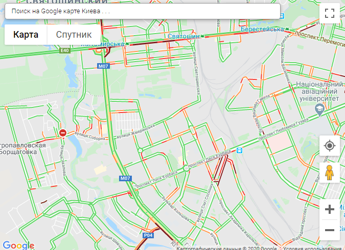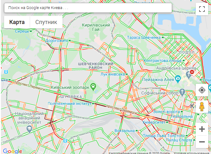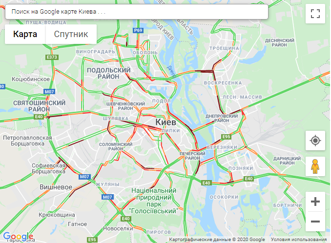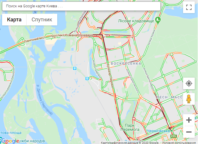 По данным онлайн-сервиса Google Maps, на правом берегу столицы пробки образовались на проспекте Победы, проспекте Курбаса, Большой Окружной, на бульваре Тараса Шевченко, ул Жилянской, ул. Михаила Грушевского, ул. Щусева, ул. Скляренка, ул. Семьи Сосниных, на Воздухофлотском проспекте, ул. Дегтяревской, ул. Вадима Гетьмана, ул. Набережно-Крещатицкой и Набережно-Рыбальской.