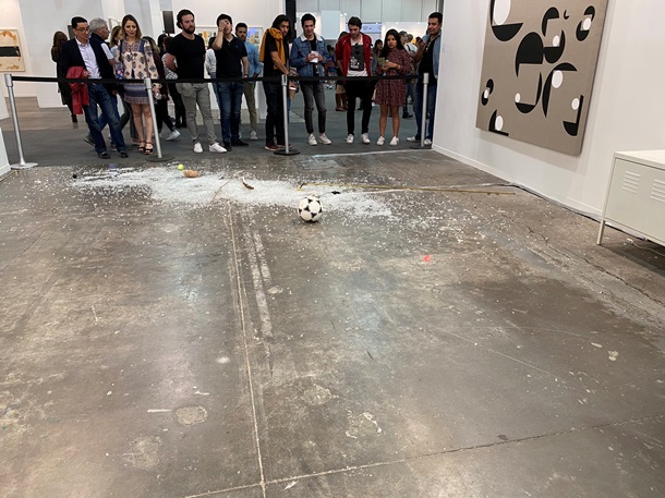 Произведение современного искусства состояло из стекла, за которым были размещены футбольный и теннисный мяч, камни, перья и несколько других предметов.