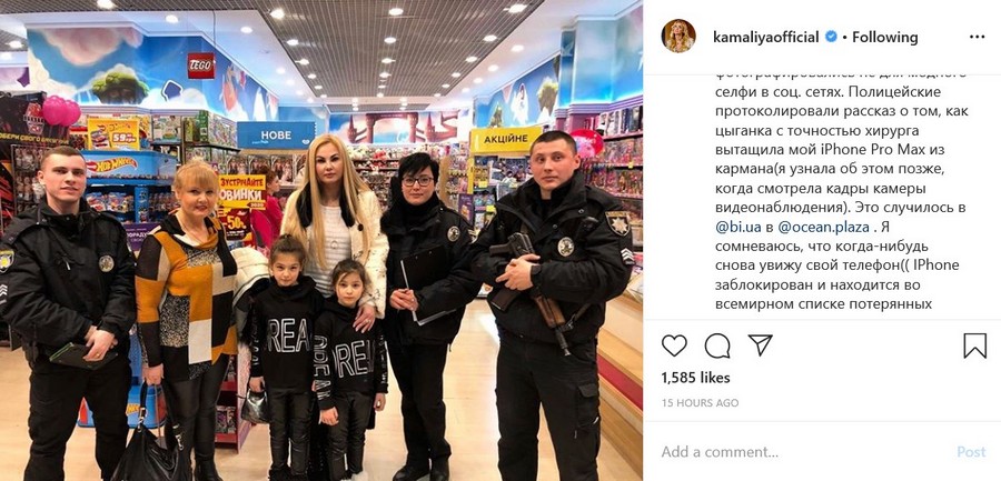 "Цыганка с точностью хирурга вытащила мой iPhone Pro Max из кармана (я узнала об этом позже, когда смотрела кадры камеры видеонаблюдения). Сомневаюсь, что когда-нибудь снова увижу свой телефон", - прокомментировала снимок певица.