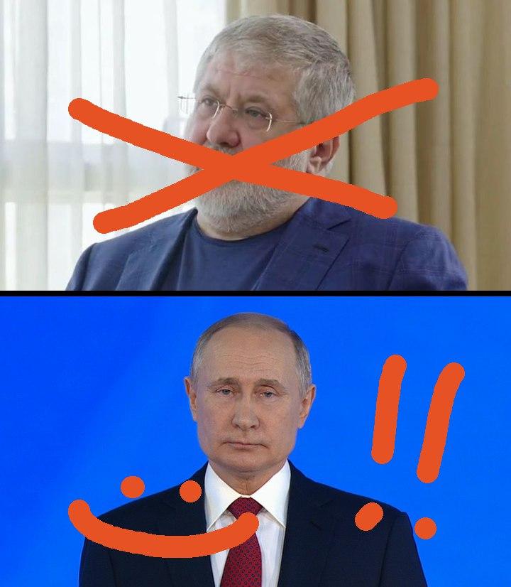 На следущей фотожабе изобразили недовольство кадровыми изменениями украинского олигарха Игоря Коломойского и радость президента РФ Владимира Путина. В сети пишут, что назначенный глава ОПУ симпатизирует России и Путину.