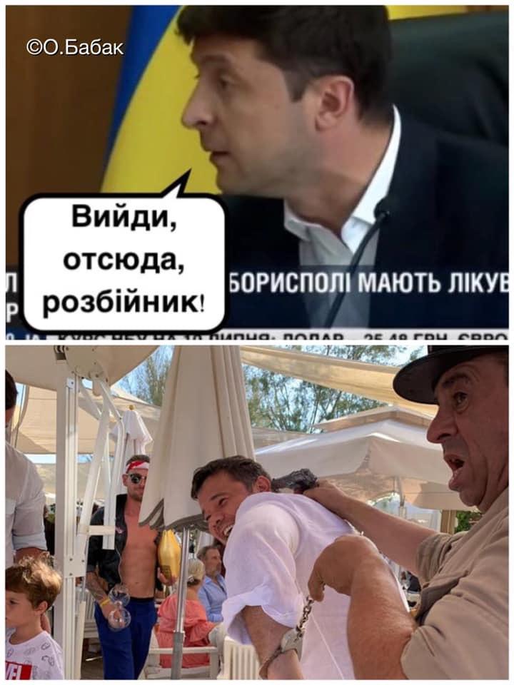 Еще одна картинка изображает президента Владимира Зеленского с его известной фразой в Борисполе "выйди отсюда, разбойник", на следующем кадре шуточный арест Андрея Богдана американским "шерифом".
