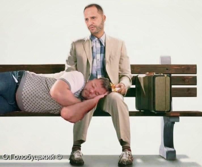 На одной из картинок изображен Богдан, который спит на коленях своего приемника Андрея Ермака. Они сидят на вокзале, рядом чемодан.