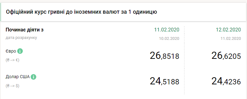 Национальный банк Украины на среду, 12 февраля, укрепил курс гривны почти на 10 копеек по отношению к доллару и на 23 копейки по отношению к евро, передает FaceNews.ua. Об этом свидетельствуют данные на сайте регулятора во вторник, 11 февраля.