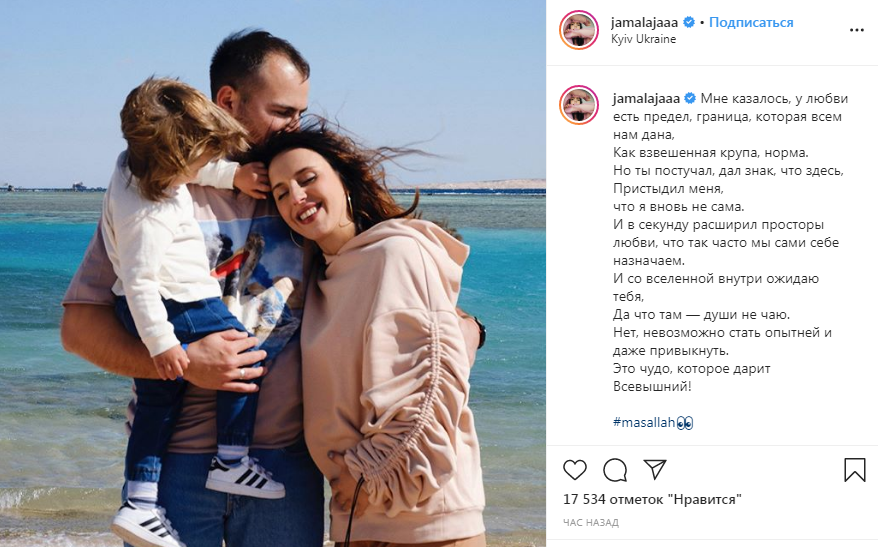 "Мне казалось, у любви есть предел, граница, которая всем нам дана, Как взвешенная крупа, норма.Но ты постучал, дал знак, что здесь, Пристыдил меня, что я вновь не сама. И в секунду расширил просторы любви, что так часто мы сами себе назначаем. И со вселенной внутри ожидаю тебя,Да что там — души не чаю. Нет, невозможно стать опытней и даже привыкнуть. Это чудо, которое дарит Всевышний", – такую подпись сделал Джамала под снимок.