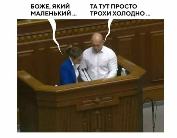 На фотожабе, которая появилась в Facebook-сообществе «Баба і кіт», политики стоят возле трибуны, их взгляд направлен вниз. В диалоге речь идет о довольно пикантном вопросе.