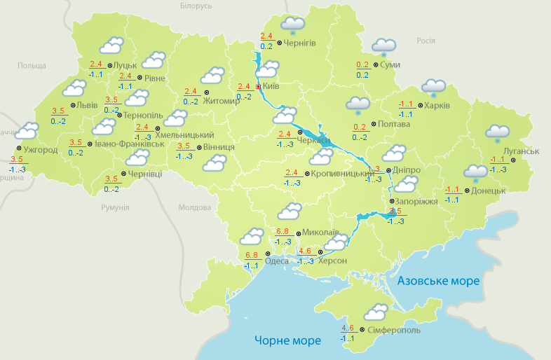 Температура воздуха в большинстве областей Украины в течение дня будет колебаться в пределах +1+6 градусов, в южной части– +4+8 градусов.