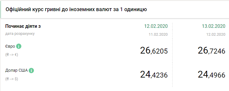 Национальный банк Украины на четверг, 13 февраля, опустил курс гривны на семь копеек по отношению к доллару и на 10 копеек по отношению к евро, передает FaceNews.ua. Об этом свидетельствуют данные на сайте регулятора в среду, 12 февраля.