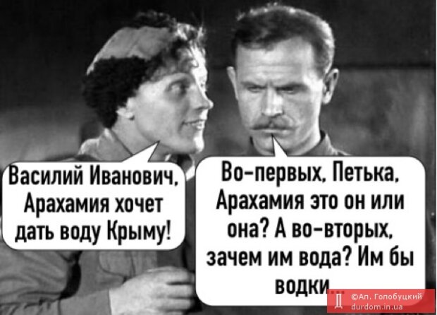 Мужчина выставил кадр из известного фильма, где идет диалог между двумя мужчинами. Один говорит: «Василий Иванович, Арахамия хочет дать воду Крыму», на что тот ему отвечает: «Во-первых, Петька, Арахамия это он или она? А во вторых, зачем им вода: Им бы водки».