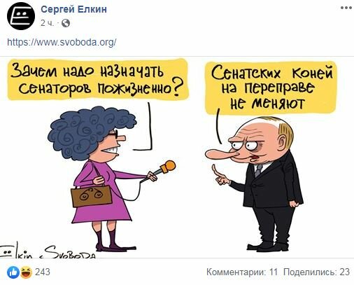 "В идеале конечно они хотят нормальный такой феодализм, когда родился и уже потомственный сенатор", " Гыгышная гармошка на брюках, всё, как у пока еще живого дедуси в ТВ", "Одно радует, что историю, которую своими рисунками пишет Ёлкин, в будущем невозможно будет переписать!", "Слова "назначение сенаторов" звучит как насмешка над здравым смыслом..", "А может взять за основу другую поговорку: "Загнанных лошадей пристреливают", - шутят пользователи в комментариях под новой карикатурой.