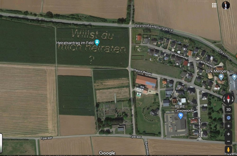 Забавно, но примерно в эти же дни поле Стефана угодило в кадр, сделанный спутником Google Maps. Теперь его уникальное предложение любимой можно отыскать в приложении (город Хюттенберг, Германия).