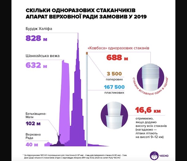 Верховная Рада в 2019 году приобрела 171 тысячу одноразовых стаканчиков для питья: 167,5 тысяч из них - пластиковые, еще 3,5 тысячи - бумажные, передает FaceNews.ua. Башня из стольких стаканчиков, плотно вставленных один в другой, достигает 688 метров в высоту.