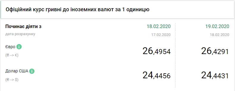 Национальный банк Украины на среду, 19 февраля, укрепил курс гривны почти на одну копейку по отношению к доллару и на семь копеек по отношению к евро, передает FaceNews.ua. Об этом свидетельствуют данные на сайте регулятора во вторник, 18 февраля.
