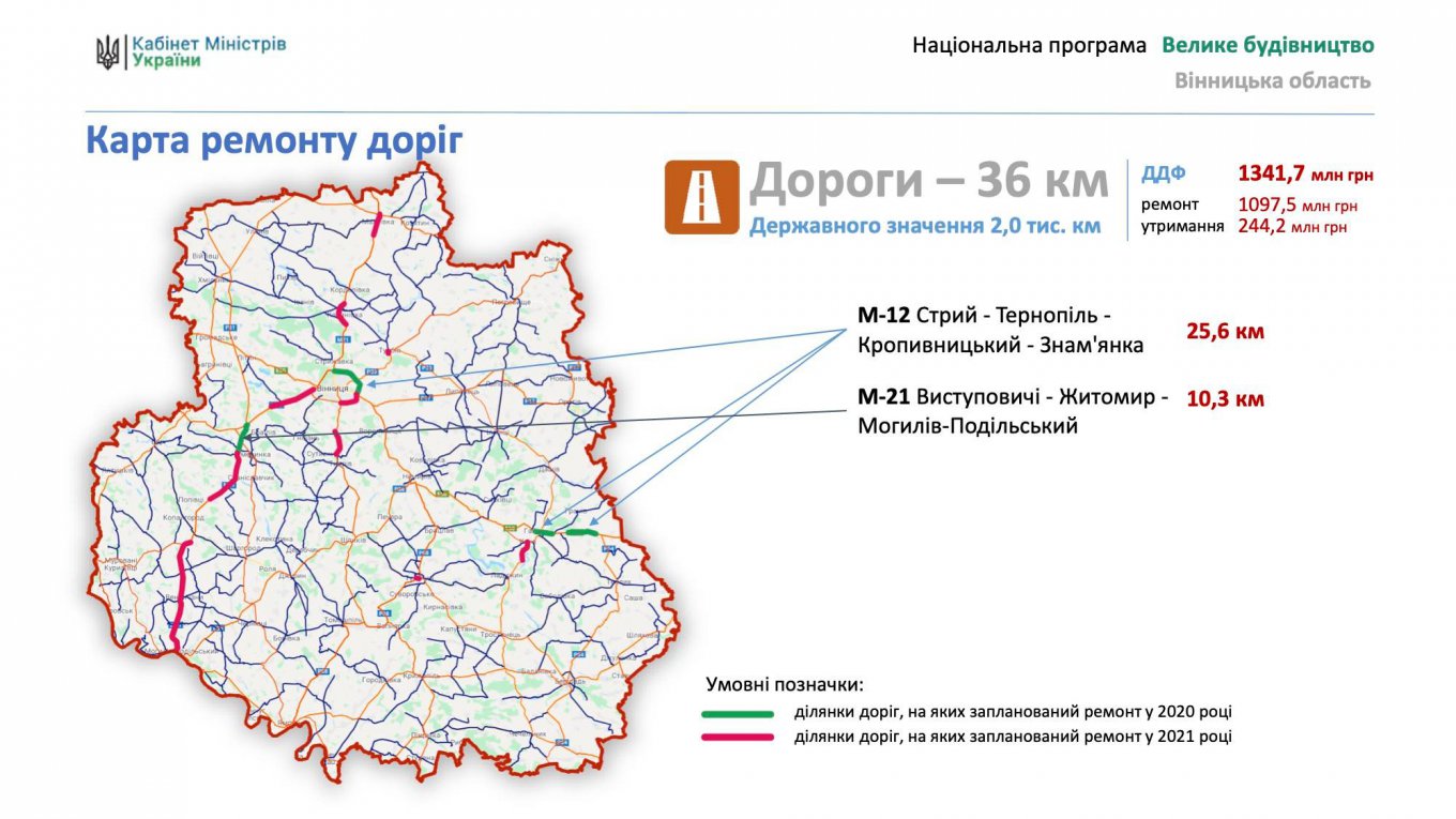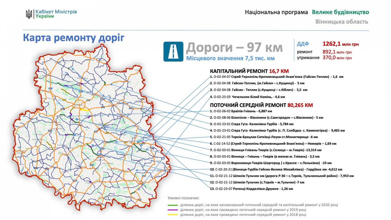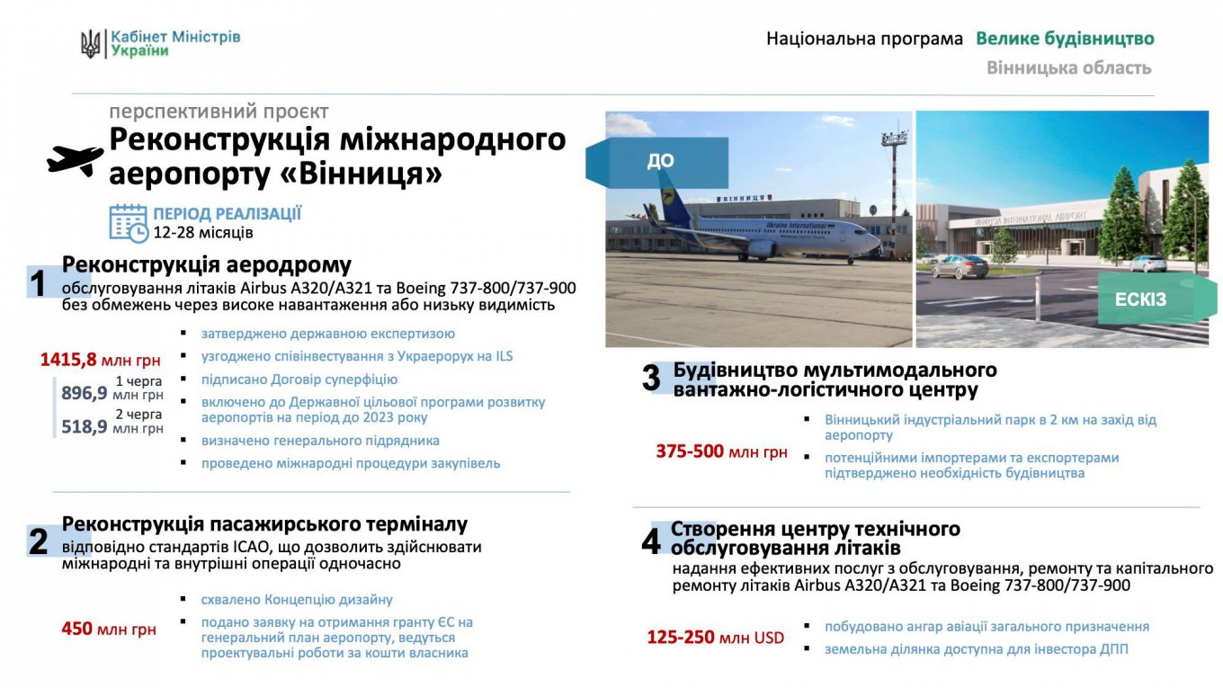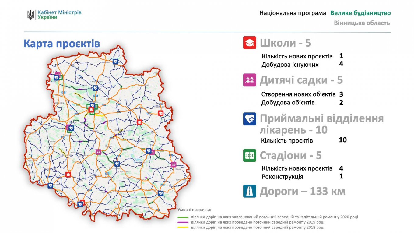 В рамках программы на Винничине планируется реконструкция Винницкого аэропорта, ремонт 133 км дорог местного и государственного значения, строительство и достройка 5 школ, 5 детских садов, 5 стадионов и 10 приемных отделений больниц.