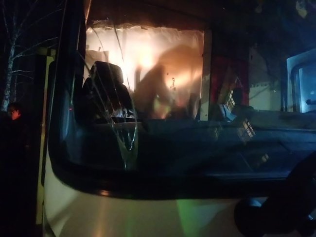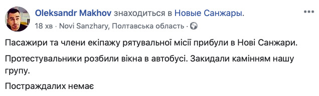 "Пассажиры и члены экипажа спасательной миссии прибыли в Новые Санжары. Протестующие разбили окна в автобусе. Забросали камнями нашу группу. Пострадавших нет", — написал журналист в Фейсбуке.