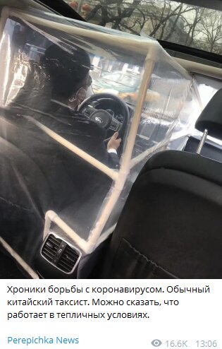На фото, которое опубликовали на канале «Perepichka News» в Telegram, видно, как водитель натянул на себя специальный бокс, обтянутый полиэтиленом. При этом бокс охватывает полностью все переднее место водителя, начиная от его дверей, заканчивая границей с пассажирским сидением. Видимо, таксист решил кардинально защитить себя от протекающего вируса. Это сразу же облетело все социальные сети и стало очередным креативным средством защиты.