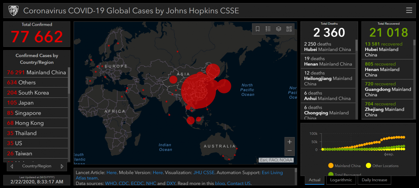 Об этом свидетельствуют данные онлайн-карты распространения заболевания Исследовательского центра системных наук и инженерии Университета Джонса Хопкинса в США, передает FaceNews.ua.