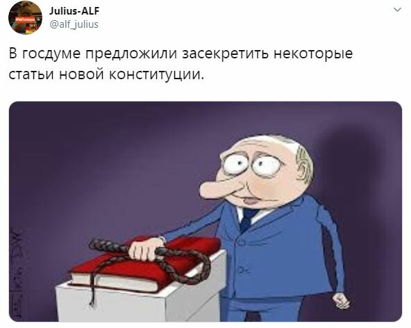 «Законы пишутся для людей. Похоже население РФ давно не считают за людей», «Да всю засекретить и всё… Чё думать-то…», «И куплет из государственного гимна засекретьте… Ну там, где про боже, царя храни. При исполнении, будете просто, в этом месте беззвучно открывать рты…», «Потому что конституция не для всех», «Гениально!», «Красота. Как раз этого нам, в наших серых буднях и не хватало», «Цирк», — пишут пользователи в комментариях под публикацией блогера.
