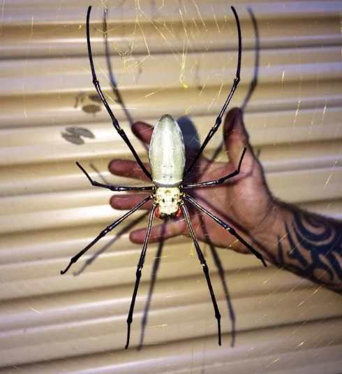 Размер паука составляет примерно 15-17 см, что вдвое больше руки зятя Берга, которая изображена на фоне огромной существа.