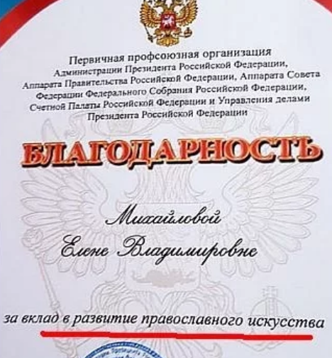 Кроме того, Михайлова позиционирует себя как православная верующая, а также - мастер-ювелир. Грамоту ей выдали как раз за изготовление ювелирных украшений на христианскую тематику. В самой грамоте написано: «За вклад в православное искусство».